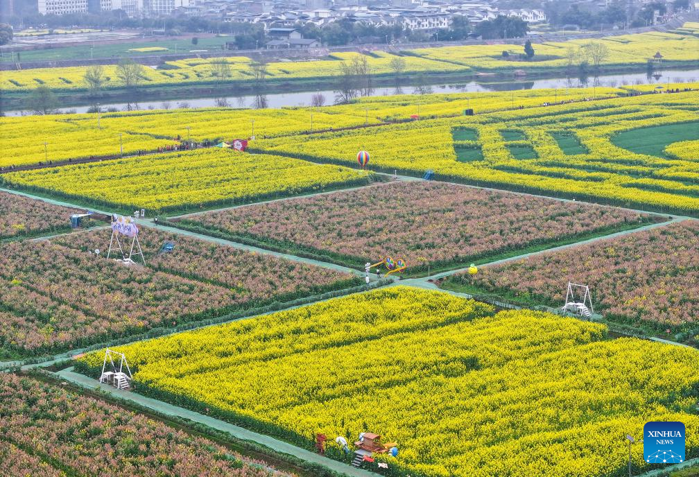 An aerial drone photo taken on March 12, 2025 shows tourists enjoying the scenery of rapeseed flowers at Chongkan scenic spot in Tongnan District, southwest China's Chongqing Municipality. As spring unfolds, rapeseed flowers here have entered the blooming season, attracting tourists to visit. (Xinhua/Wang Quanchao)