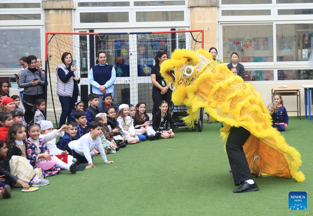 People watch a lion dance during a multicultural event at the Paola Primary School in Paola, Malta, on March 12, 2025. Students at Paola Primary School in southeastern Malta were captivated by an array of Chinese cultural activities during the school's multicultural event on Wednesday. (Xinhua/Chen Wenxian)