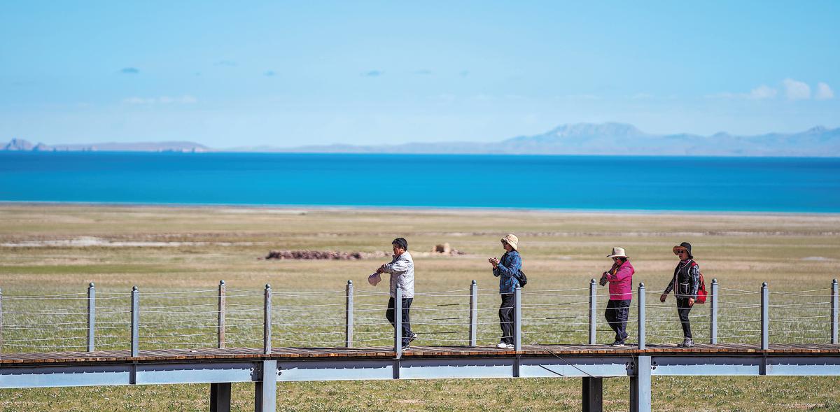 Tourists walk a raised path by the Siling Co (Lake) in the Xizang autonomous region in June. The lake and its surrounding natural reserve serve as an important habitat for black-necked cranes. (Tenzin Nyida/Xinhua)