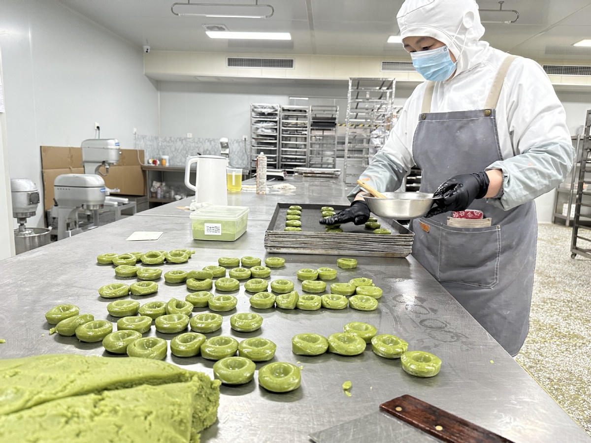 A worker uses kale to make cakes at a workshop in Gaomi, Shandong province. (Zhao Ruixue/China Daily)