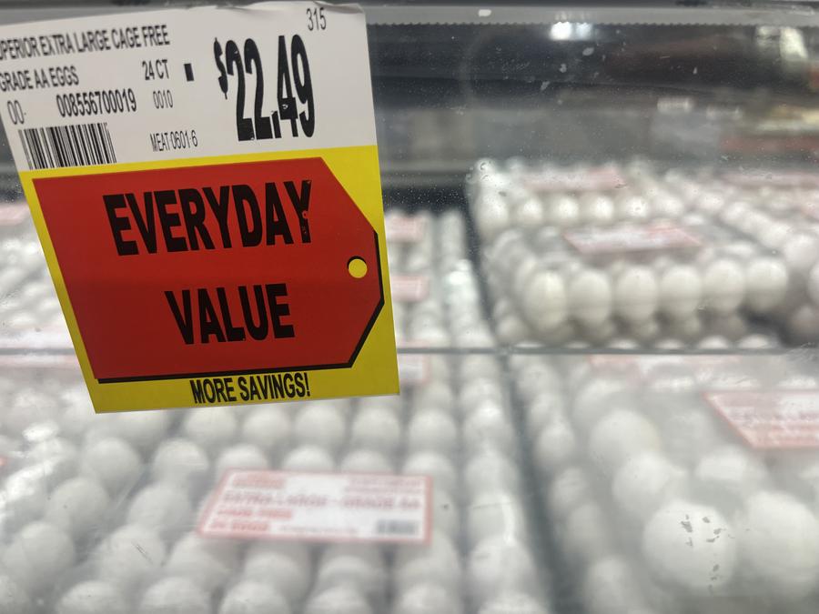 This photo taken with a mobile phone on Feb. 7, 2025 shows a price tag on a shelf for eggs at a local supermarket in El Monte, Los Angeles County, California, the United States. (Photo by Zeng Hui/Xinhua)
