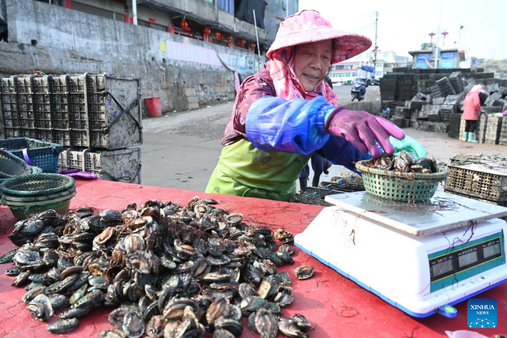 A woman sorts out abalones at a wharf in Lianjiang County, southeast China's Fujian Province, March 12, 2025. As the weather warms up, fishermen in Lianjiang start abalone farming and sowing. (Xinhua/Lin Shanchuan)