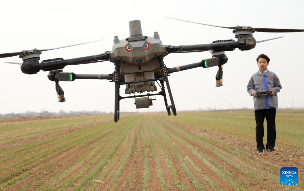Farmers operate a drone to fertilize a wheat field in Hezhuang Village, Jurong City of east China's Jiangsu Province, March 14, 2025. Various modern technologies are being used during the spring ploughing farm work across the country. (Photo by Zhong Xueman/Xinhua)