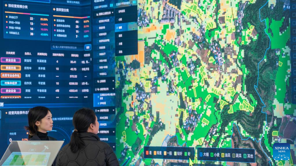 Technicians analyze the growth of crops with a satellite remote sensing system to make field management plan at a technology company at Tianfu New Area in Meishan City, southwest China's Sichuan Province, March 13, 2025. Various modern technologies are being used during the spring ploughing farm work across the country. (Photo by Weng Guangjian/Xinhua)