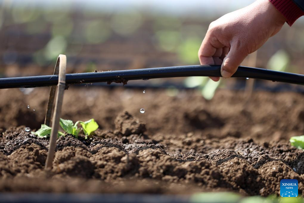 A farmer checks a drip irrigation device at a vegetable planting base in Tancheng County, Linyi County of east China's Shandong Province, March 13, 2025. Various modern technologies are being used during the spring ploughing farm work across the country. (Photo by Zhang Chunlei/Xinhua)