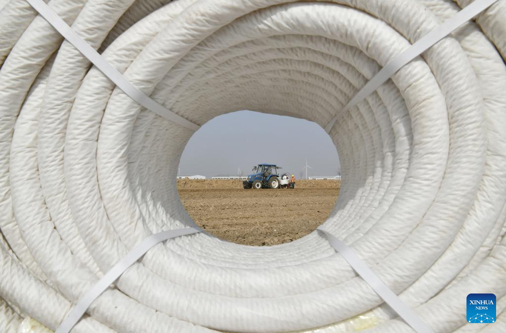 Workers lay smart underground water-saving drainage system at a farm in Huanghua City, north China's Hebei Province, March 12, 2025. Various modern technologies are being used during the spring ploughing farm work across the country. (Photo by Yuan Liwei/Xinhua)