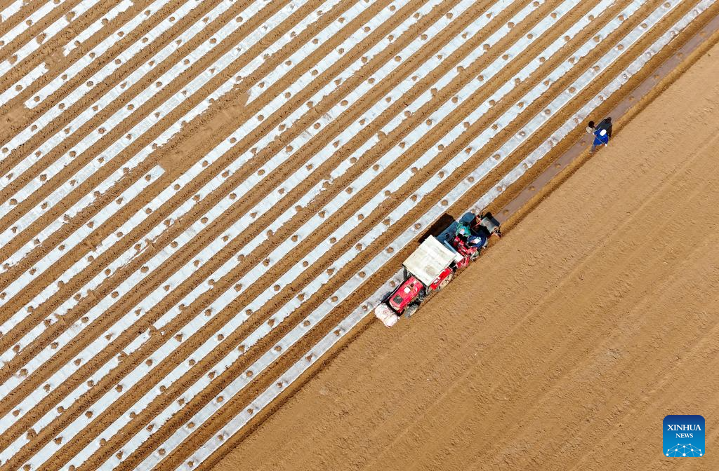 A drone photo taken on March 14, 2025 shows a potato seeding machine loaded with Beidou navigation system working in a field in Liuwang Town, Qingdao City of east China's Shandong Province. Various modern technologies are being used during the spring ploughing farm work across the country. (Photo by Zhang Jingang/Xinhua)