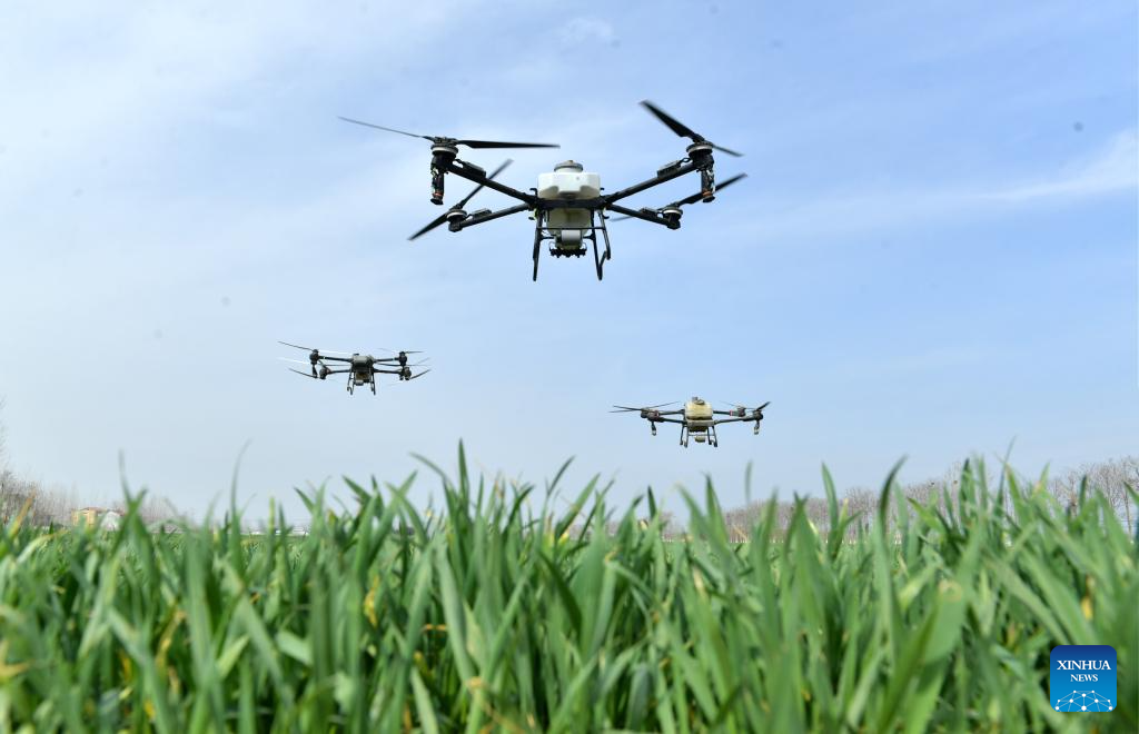 Drones work over a wheat field of an agricultural cooperative in Xiayi County, central China's Henan Province, March 13, 2025. Various modern technologies are being used during the spring ploughing farm work across the country. (Photo by Miao Yucai/Xinhua)