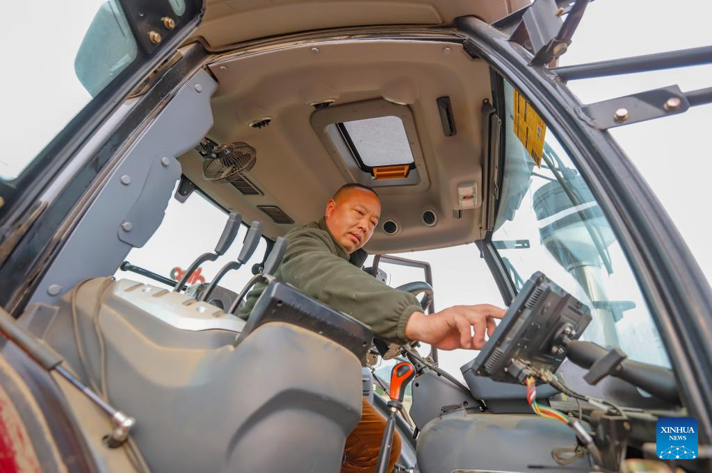 A farmer adjusts an unmanned ploughing machine at an agricultural machine cooperative in Dongxinzhuang Town, Zunhua City of north China's Hebei Province, March 14, 2025. Various modern technologies are being used during the spring ploughing farm work across the country. (Photo by Liu Mancang/Xinhua)