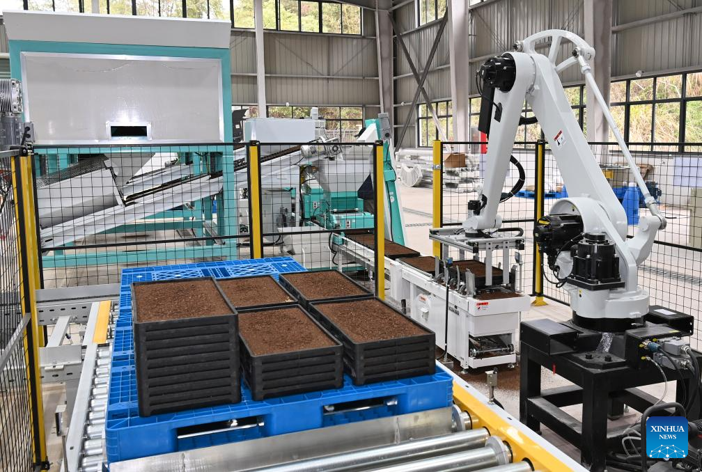 A fully automatic smart production line for making seedling cultivation plates is seen at an eco-agriculture company in Dongyang City, east China's Zhejiang Province, March 13, 2025. Various modern technologies are being used during the spring ploughing farm work across the country. (Photo by Bao Kangxuan/Xinhua)