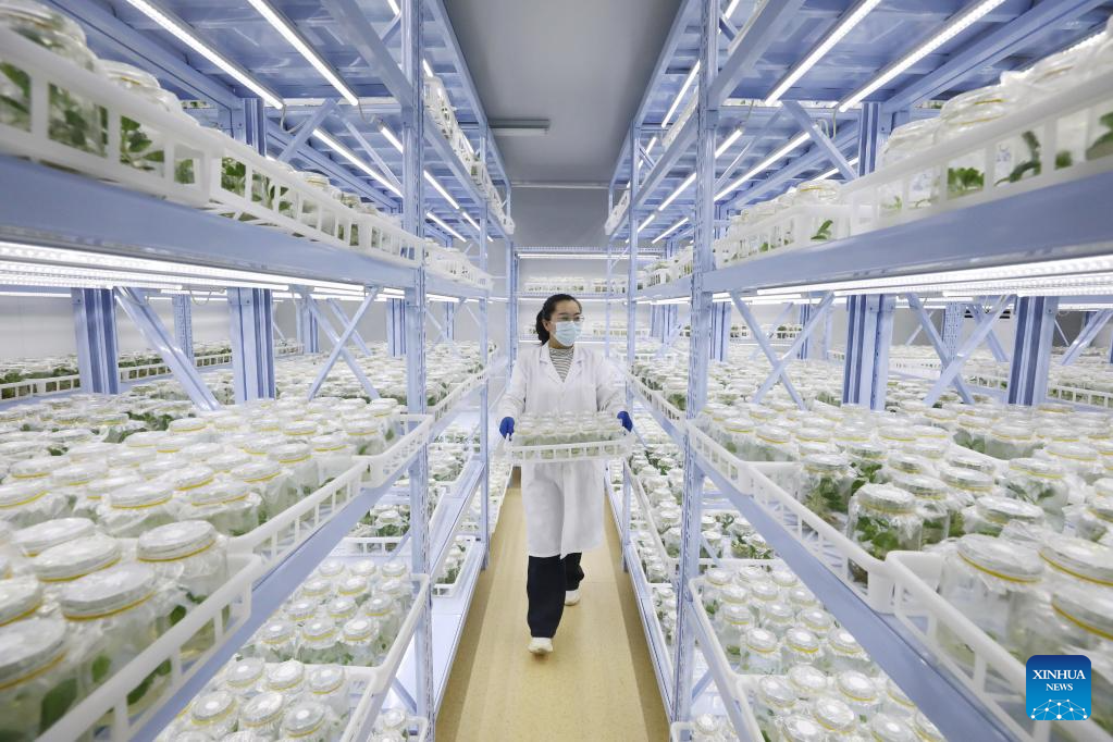 A worker arranges seedlings at a cultivation center of an agricultural research institute in Wenxian County, Jiaozuo City of central China's Henan Province, March 14, 2025. Various modern technologies are being used during the spring ploughing farm work across the country. (Photo by Xu Hongxing/Xinhua)