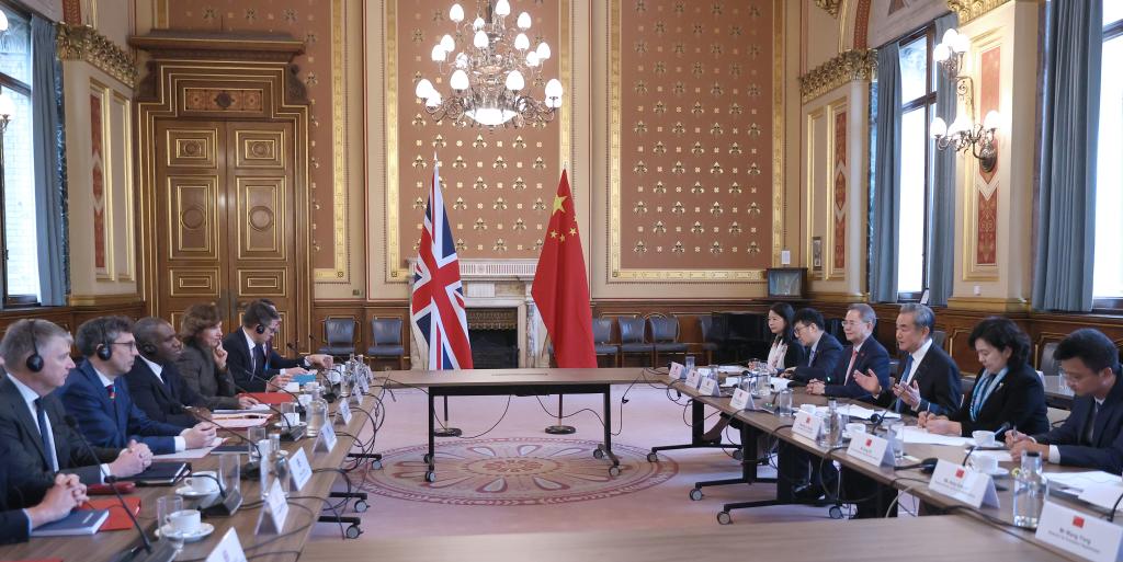 Chinese Foreign Minister Wang Yi, also a member of the Political Bureau of the Communist Party of China Central Committee, co-chairs the 10th China-UK Strategic Dialogue with British Foreign Secretary David Lammy, in London, Britain, Feb. 13, 2025. (Xinhua/Li Ying)