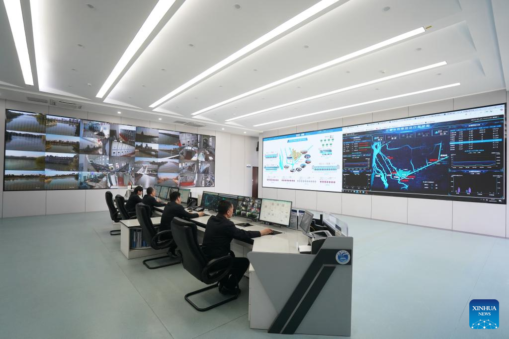 Staff members work at a control room of the Jiangdu water control project in Yangzhou, east China's Jiangsu Province, March 25, 2025. The Jiangdu water control project in Yangzhou of east China's Jiangsu Province is located at the source of the eastern route of China's gigantic South-to-North Water Diversion Project.