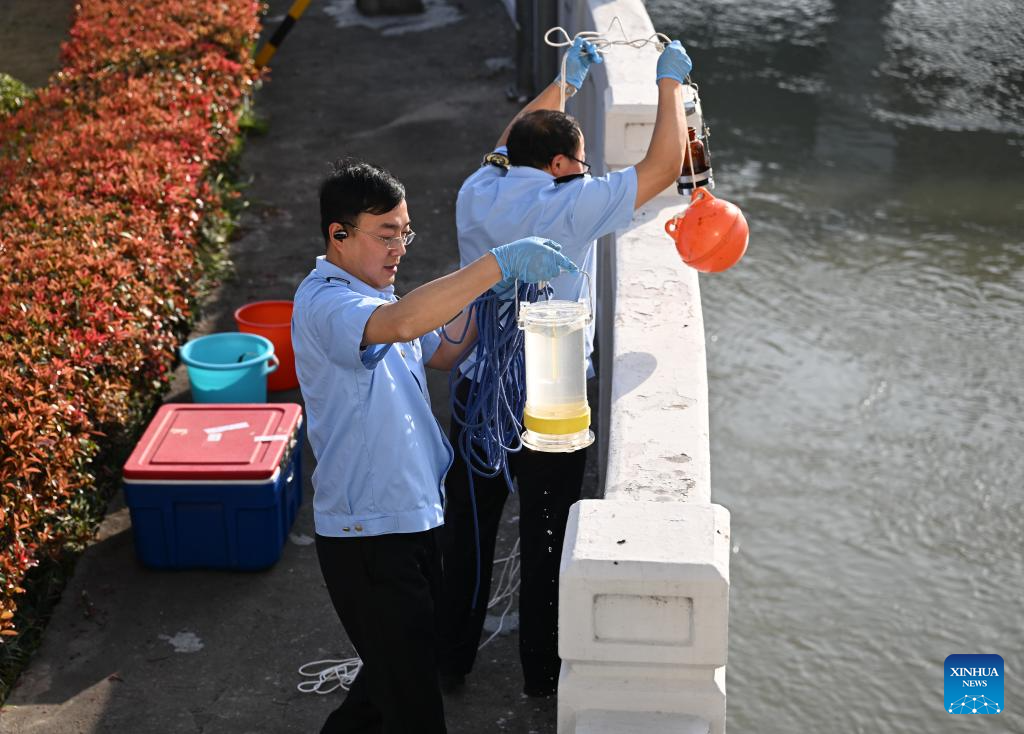 Staff members of Jiangdu ecological environment bureau take water samples on the upper reaches of the water source of the eastern route of the South-to-North Water Diversion Project in Yangzhou, east China's Jiangsu Province, March 25, 2025. The Jiangdu water control project in Yangzhou of east China's Jiangsu Province is located at the source of the eastern route of China's gigantic South-to-North Water Diversion Project.