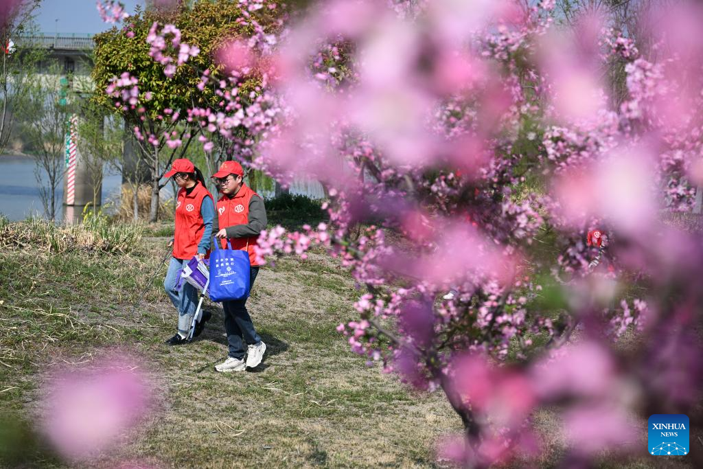 Volunteers collect rubbish along the water source of the eastern route of the South-to-North Water Diversion Project in Yangzhou, east China's Jiangsu Province, March 26, 2025. The Jiangdu water control project in Yangzhou of east China's Jiangsu Province is located at the source of the eastern route of China's gigantic South-to-North Water Diversion Project.
