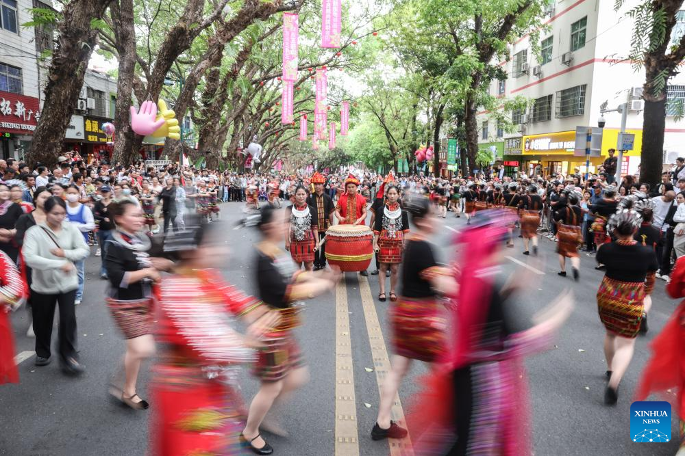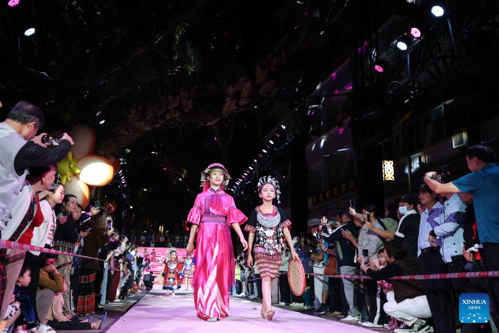 People watch a local fashion show during a Sanyuesan celebration in Wuzhishan City of south China's Hainan Province, March 30, 2025. Local people held various events in Wuzhishan to celebrate the Sanyuesan Festival which falls on the third day of the third lunar month. (Xinhua/Zhang Liyun)