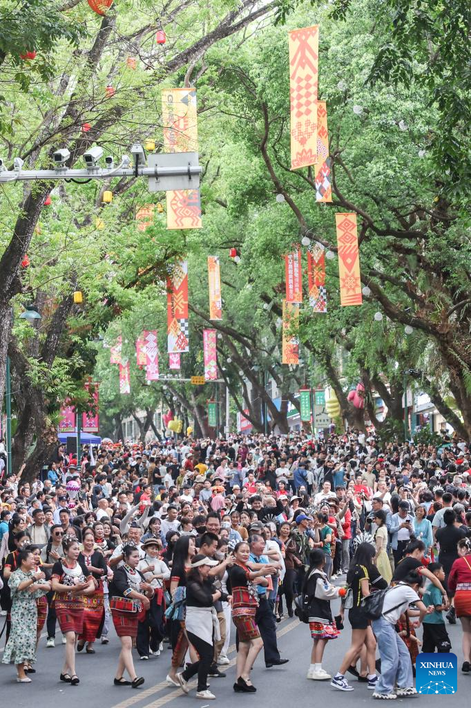 People dance during a Sanyuesan celebration in Wuzhishan City of south China's Hainan Province, March 31, 2025. Local people held various events in Wuzhishan to celebrate the Sanyuesan Festival which falls on the third day of the third lunar month. (Xinhua/Zhang Liyun)