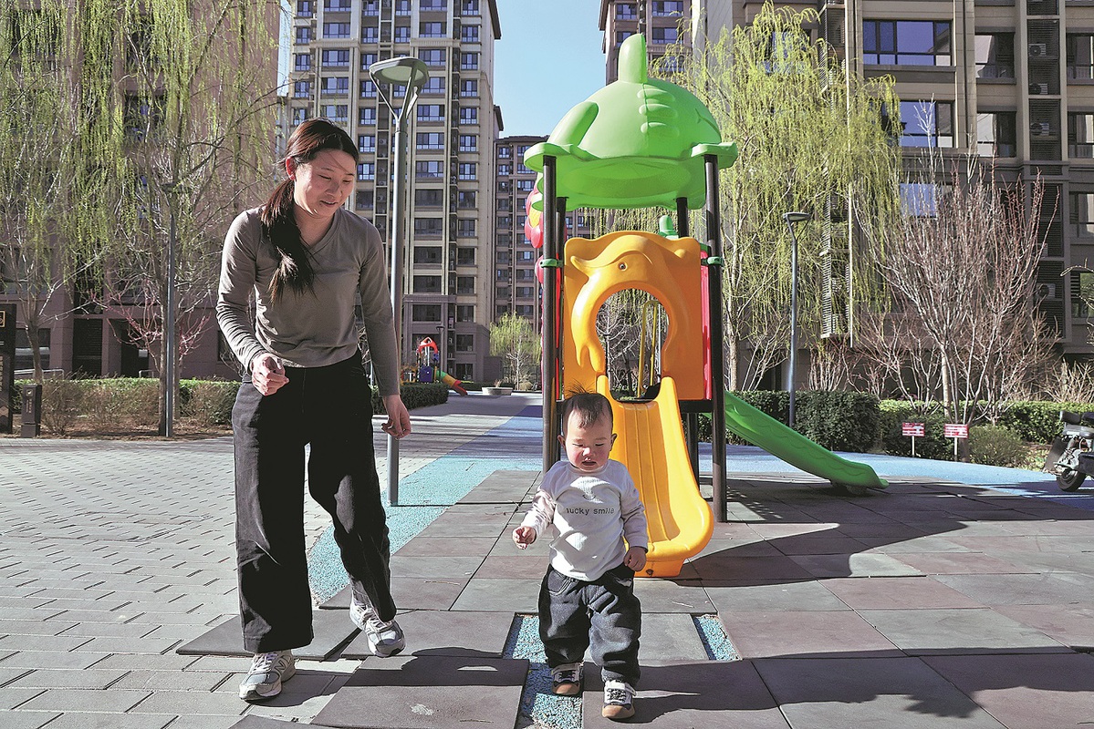 A resident plays with her child at Fujiayuan residential community in Rongdong area, Xiong'an New Area on March 20. (Wang Jing/China Daily)
