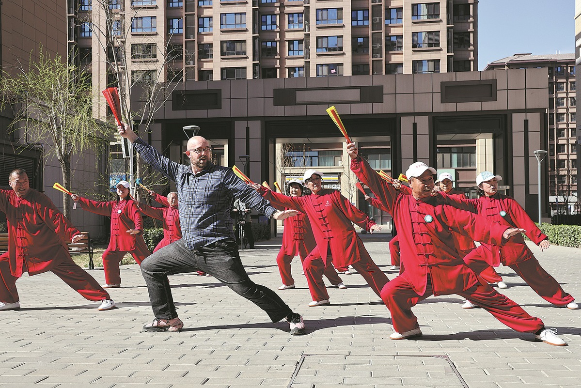 Tai chi enthusiasts engage in group exercises in Ding'an community, Rongdong area. (Wang Jing/China Daily)