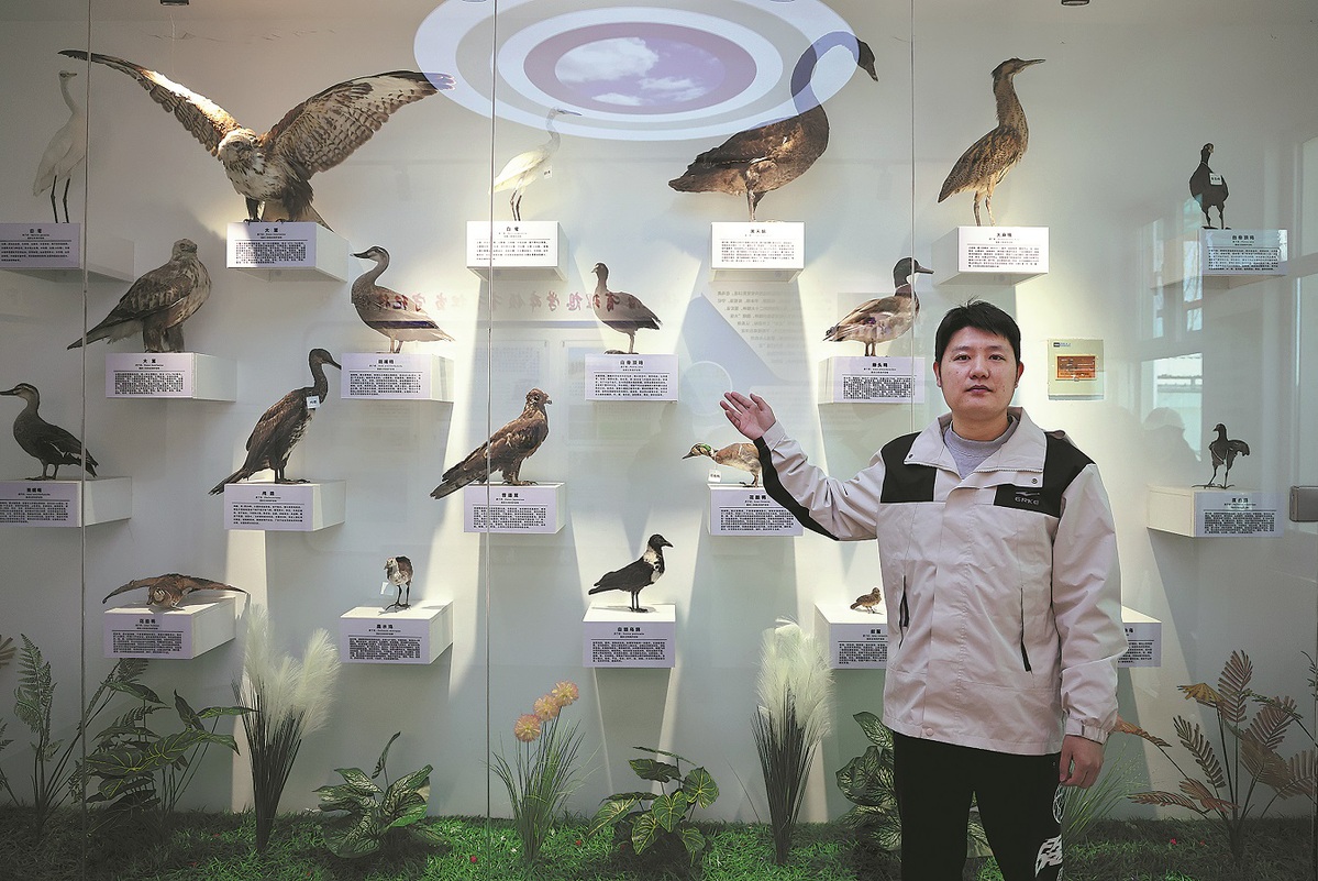 An inspector explains bird habitat conditions at a bird monitoring station in Baiyangdian Scenic Area in Xiong'an. (Wang Jing/China Daily)