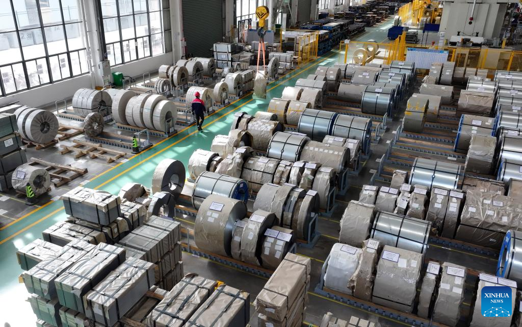 An aerial drone photo taken on March 31, 2025 shows a lifting machine transferring materials at a workshop of an auto parts manufacturing company in Feixi County of Hefei, east China's Anhui Province. In recent years, Feixi County has fostered the cluster development of emerging industries including new energy and intelligent connected vehicles, integrated circuits, advanced photovoltaic and energy storage, biomedicine, low-altitude economy, etc. to inject momentum into the county's high-quality economic development. (Photo by Xu Yong/Xinhua)