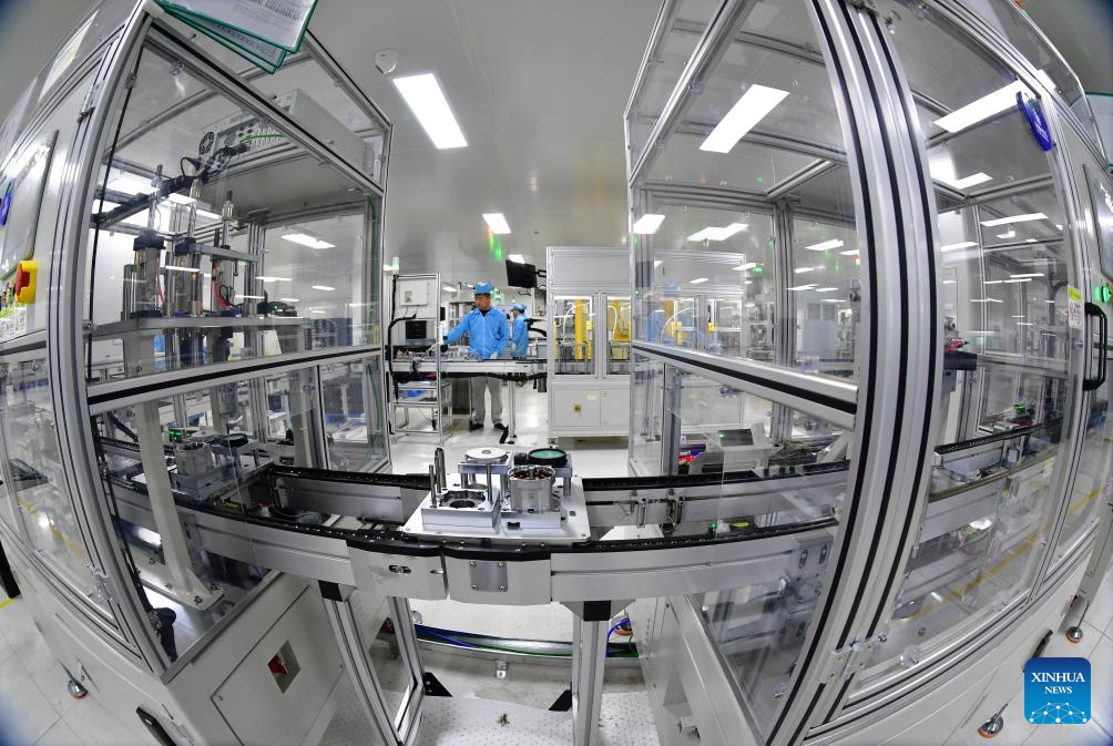A technician works on a production line of electric oil pumps at a workshop of Hengxin Powertrain Technology Co., Ltd. in Feixi County of Hefei, east China's Anhui Province, March 31, 2025. In recent years, Feixi County has fostered the cluster development of emerging industries including new energy and intelligent connected vehicles, integrated circuits, advanced photovoltaic and energy storage, biomedicine, low-altitude economy, etc. to inject momentum into the county's high-quality economic development. (Photo by Xu Yong/Xinhua)