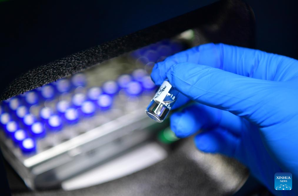 A technician conducts liquid detection of newly-developed products at HeCheng Biotechnology Co., Ltd. in Feixi County of Hefei, east China's Anhui Province, March 31, 2025. In recent years, Feixi County has fostered the cluster development of emerging industries including new energy and intelligent connected vehicles, integrated circuits, advanced photovoltaic and energy storage, biomedicine, low-altitude economy, etc. to inject momentum into the county's high-quality economic development. (Photo by Xu Yong/Xinhua)