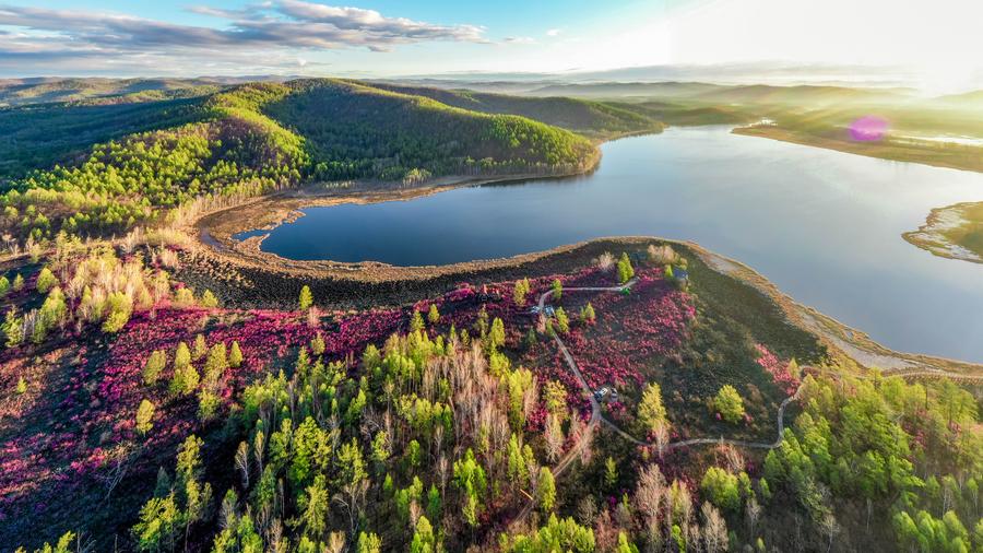 An aerial drone photo taken on May 4, 2021 shows blooming azalea flowers in the Darbin Lake National Forestry Park in north China's Inner Mongolia Autonomous Region. (Photo by Li Ming/Xinhua)