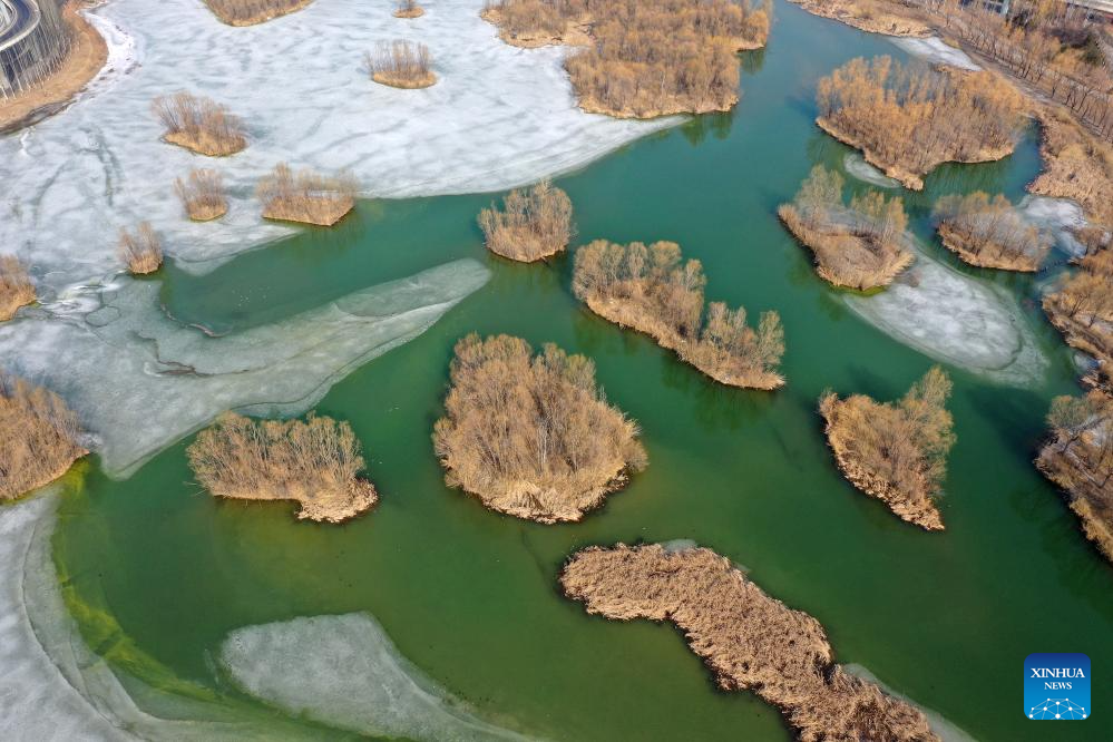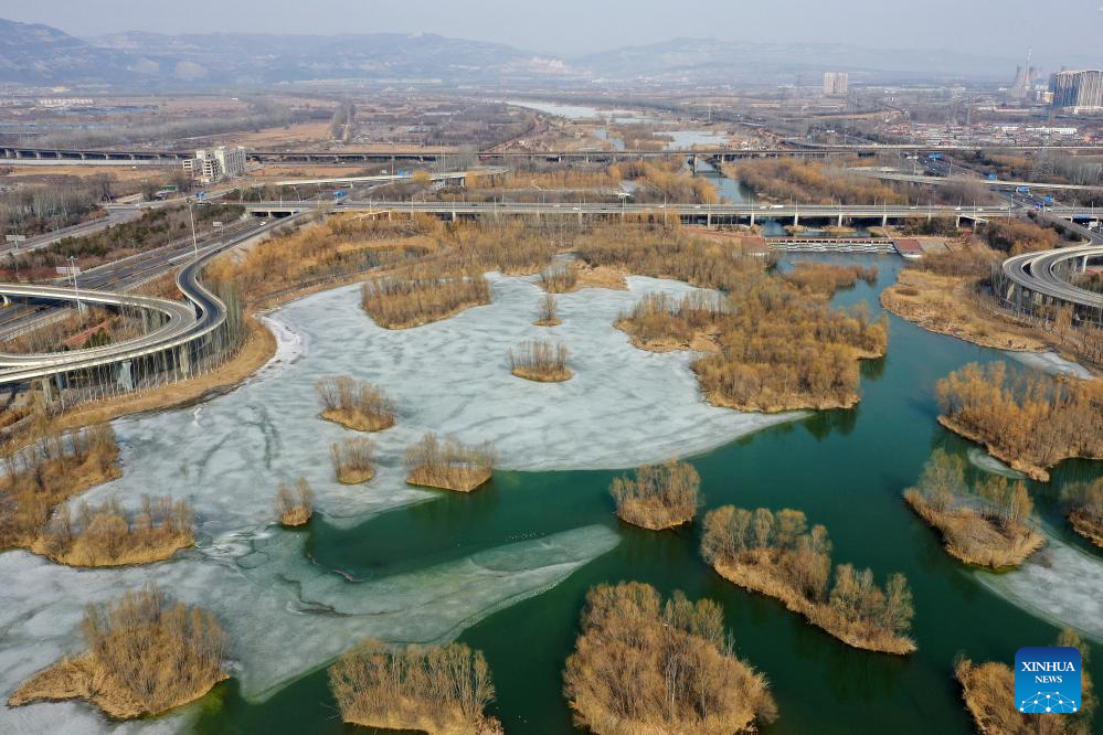 An aerial drone photo taken on Feb. 19, 2025 shows a wetland of the Fenhe River in Taiyuan City, north China's Shanxi Province.