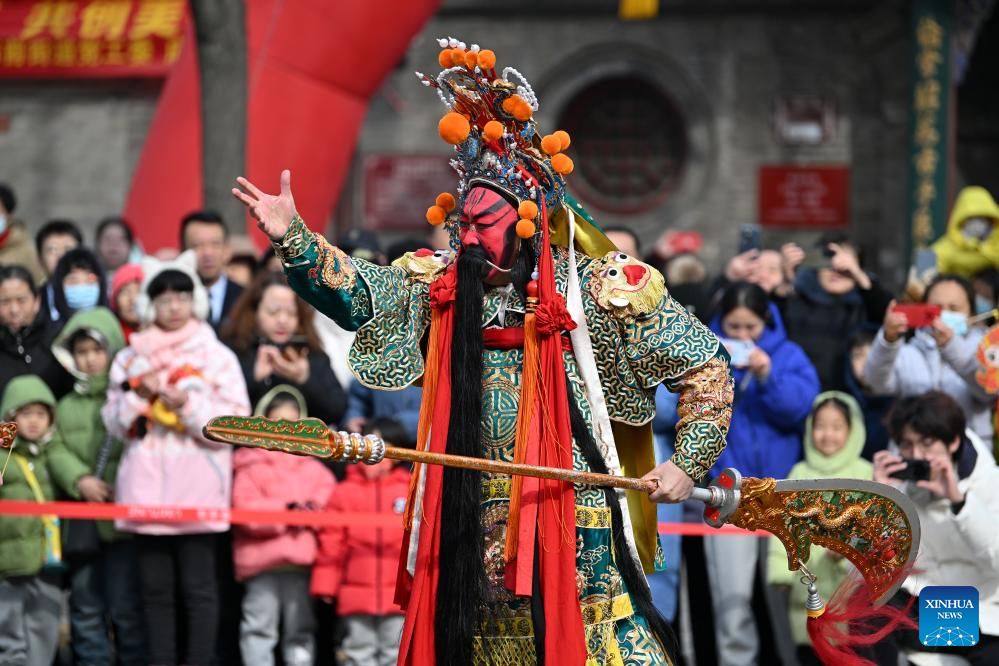 People enjoy a performance on a street in Yingze District of Taiyuan, north China's Shanxi Province, Feb. 23, 2024.
