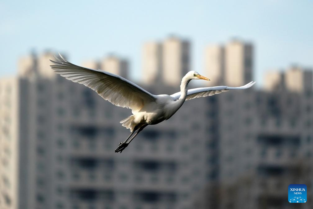 An egret flies over the Fenhe River in Taiyuan, north China's Shanxi Province, Jan. 1, 2025.