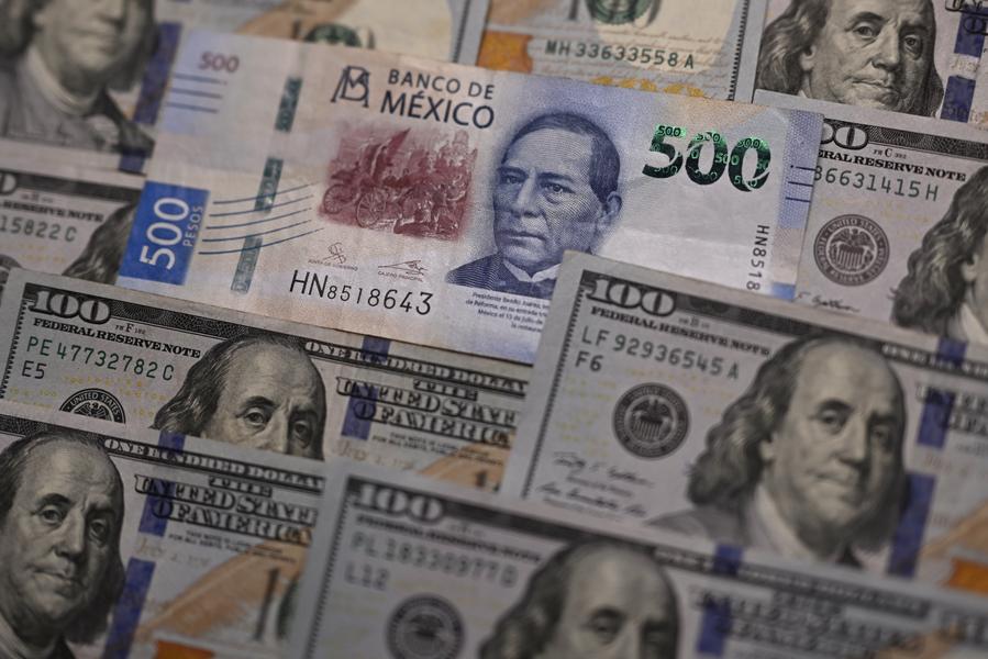 A five-hundred Mexican peso banknote is pictured with one-hundred U.S. dollar bills in Mexico City, Mexico, March 4, 2025. (Xinhua/Li Muzi)