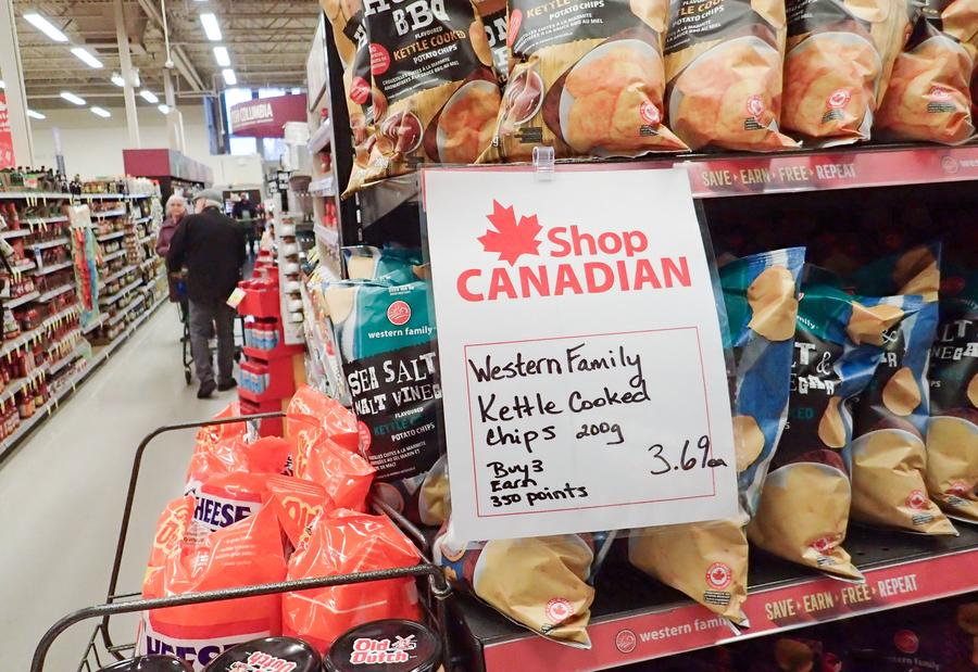 A "Shop Canadian" sign is seen at a supermarket in Vancouver, British Columbia, Canada, March 4, 2025. (Photo by Liang Sen/Xinhua)