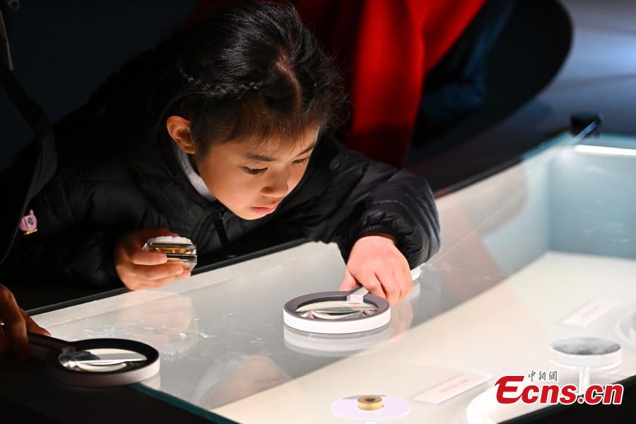 Visitors view the exhibits highlighting achievements on China's 20 years of lunar exploration at the National Museum of China, Beijing, April 1, 2025. (China News Service/Tian Yuhao)