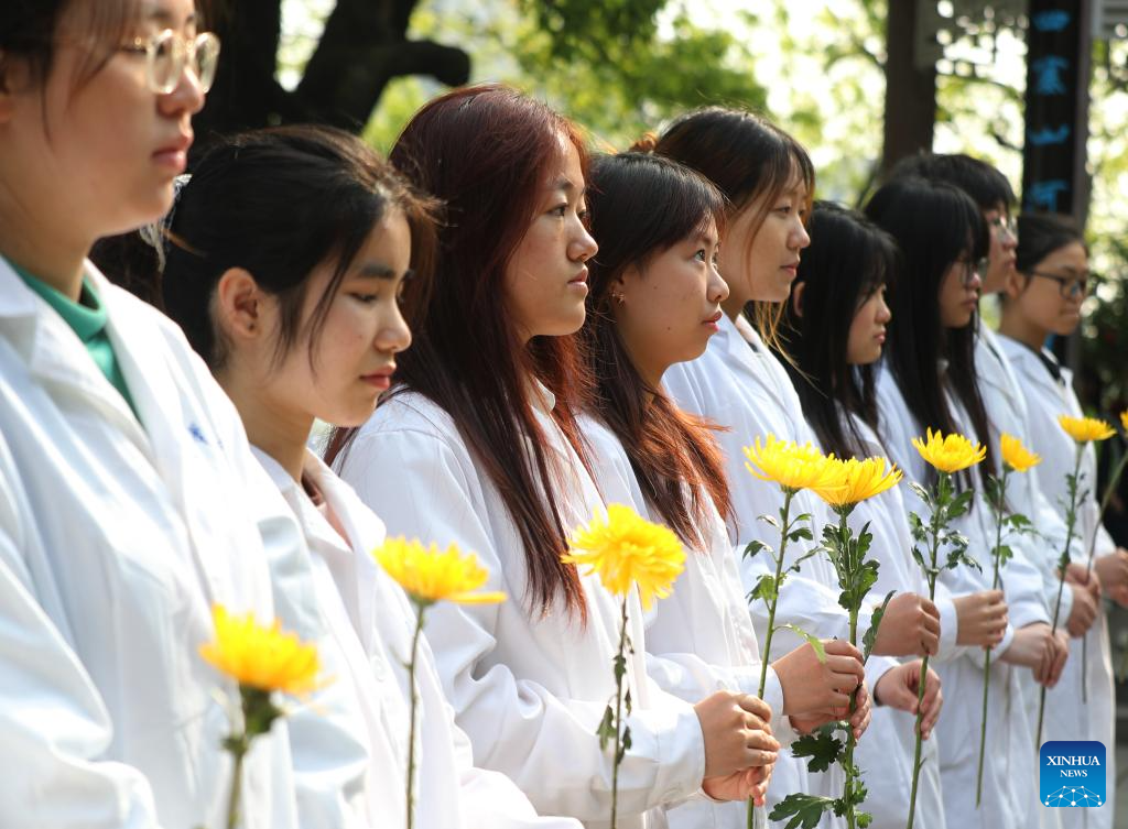 Students pay tribute to martyrs at a martyrs' cemetery in Jiyuan City of central China's Henan Province, April 2, 2025. People across the country attend tomb-sweeping activities to pay tribute to martyrs ahead of the Qingming Festival, which falls on April 4 this year. (Photo by Duan Erping/Xinhua)