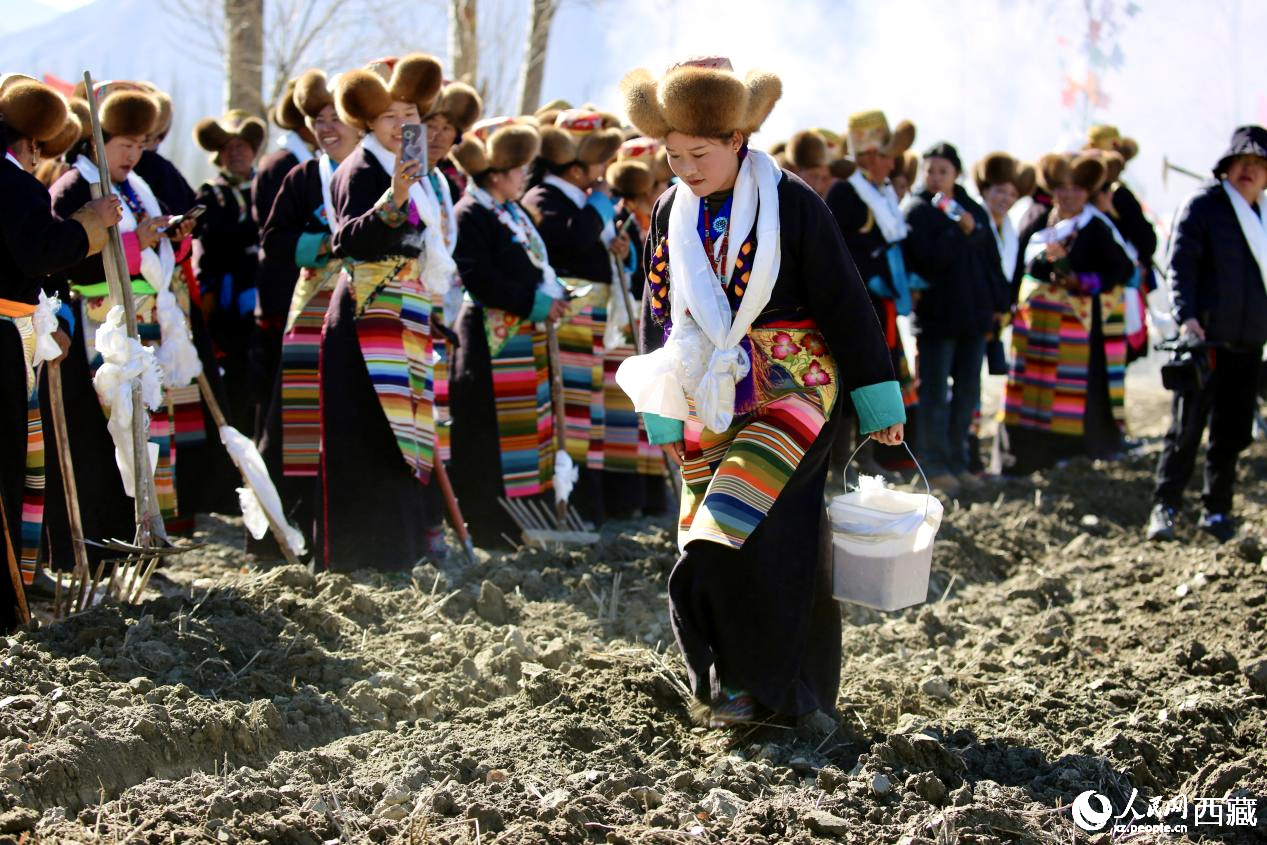 A villager in festive traditional attire scatters highland barley seeds in a village in Maizhokunggar county, Lhasa, capital of southwest China's Xizang Autonomous Region. (Photo/People's Daily Online)
