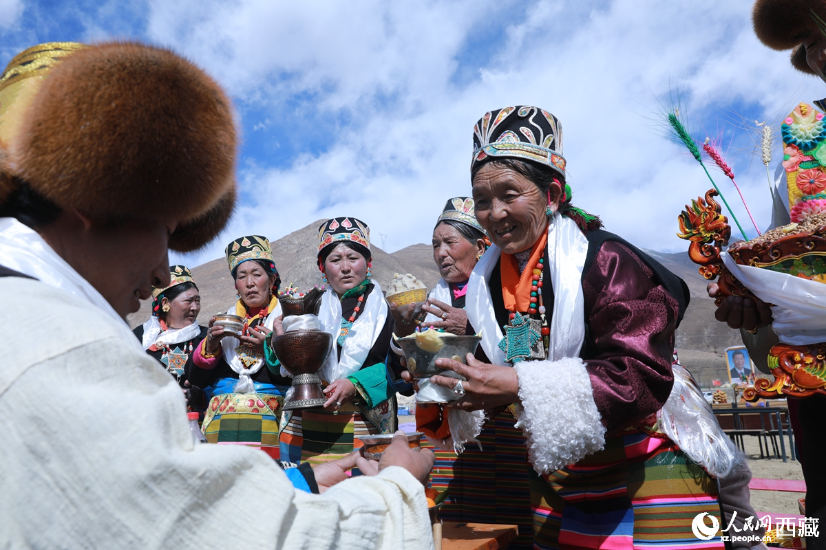 Villagers offer highland barley wine during a spring plowing ceremony in a village in Maizhokunggar county, Lhasa, capital of southwest China's Xizang Autonomous Region. (Photo/People's Daily Online)