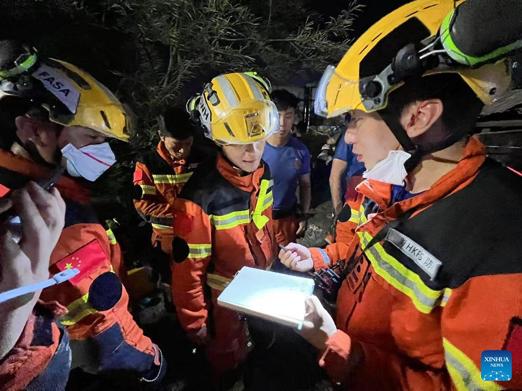 Members of a rescue team from China's Hong Kong Special Administrative Region (HKSAR) carry out search and rescue operations in Mandalay, Myanmar, April 2, 2025.