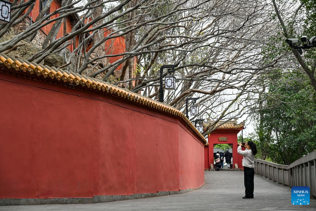 A tourist takes photos at the ancient town of Baidi in Fengjie County, southwest China's Chongqing Municipality, Feb. 13, 2025. (Xinhua/Wang Quanchao)