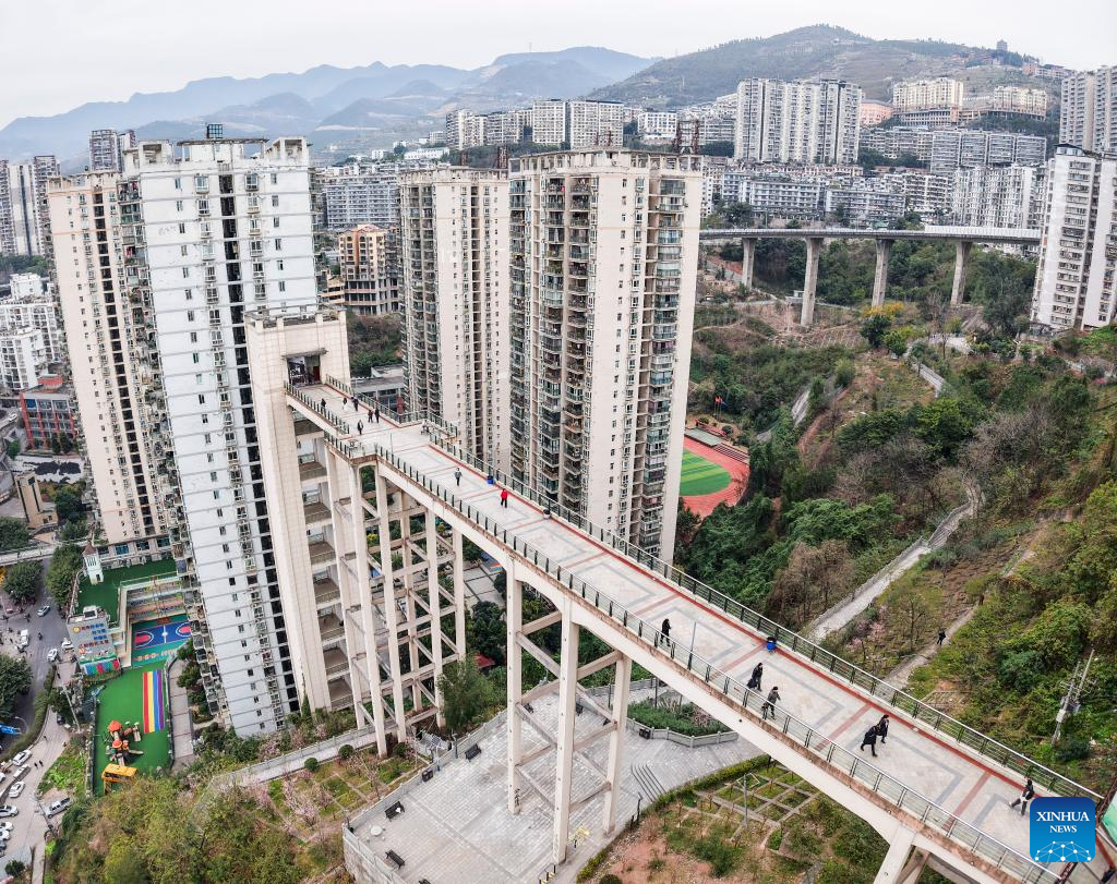 An aerial drone photo shows people walking on an overpass in Fengjie County, southwest China's Chongqing Municipality, Feb. 12, 2025. (Photo by Zhu Song/Xinhua)