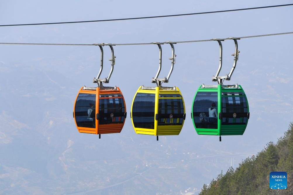 Tourists take cable cars at a scenic area in Fengjie County, southwest China's Chongqing Municipality, March 11, 2024. (Xinhua/Wang Quanchao)