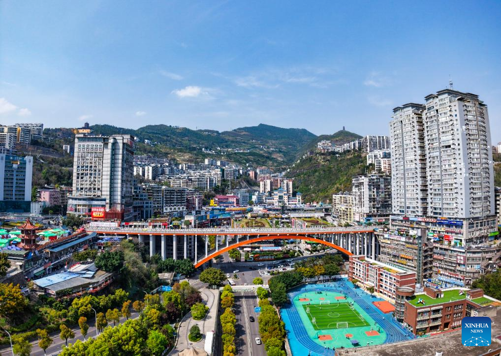 An aerial drone photo shows an urban view of Fengjie County, southwest China's Chongqing Municipality, Feb. 12, 2025. (Photo by Zhu Song/Xinhua)