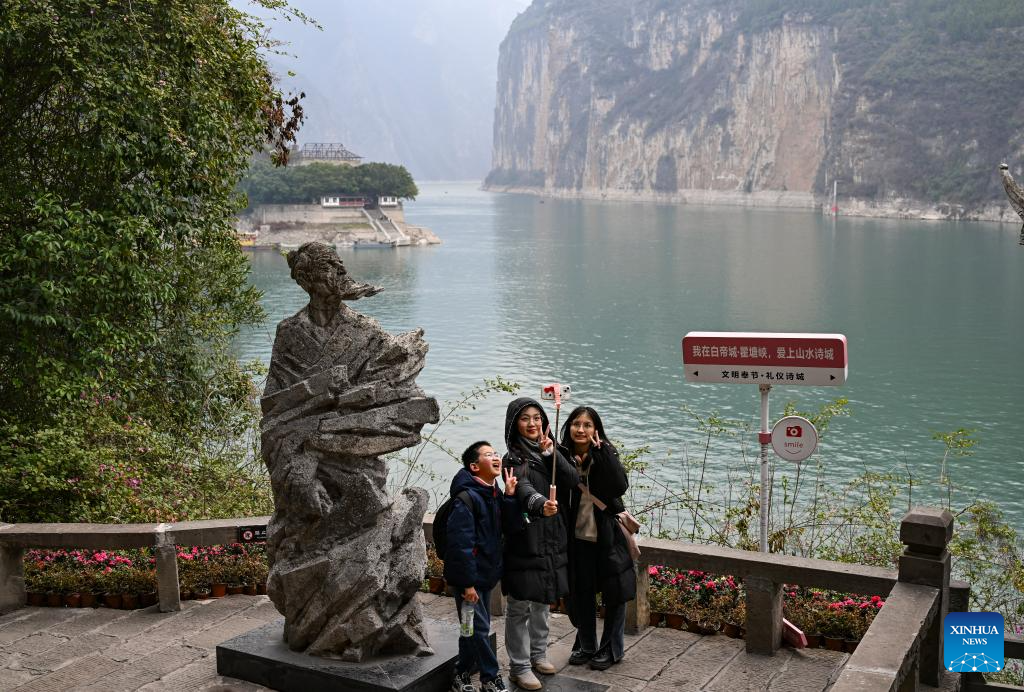 Tourists take selfies at the ancient town of Baidi in Fengjie County, southwest China's Chongqing Municipality, Feb. 13, 2025. (Xinhua/Wang Quanchao)