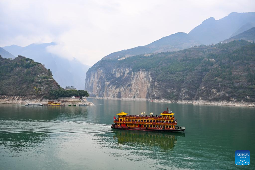 Tourists take a cruise ship to visit Qutang Gorge, one of the Three Gorges on the Yangtze River, in Fengjie County, southwest China's Chongqing Municipality, Feb. 13, 2025. (Xinhua/Wang Quanchao)