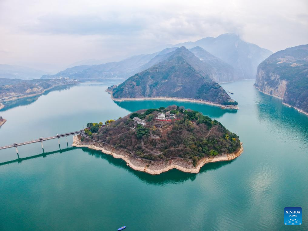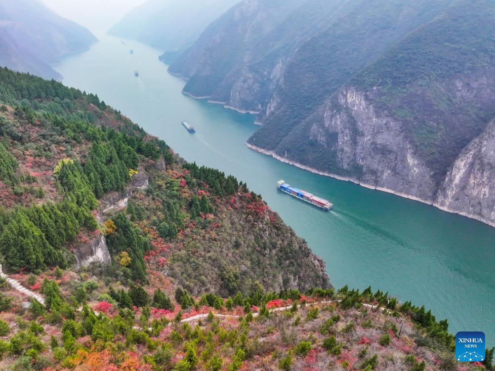 An aerial drone photo shows ships sailing in Qutang Gorge, one of the Three Gorges on the Yangtze River, in Fengjie County, southwest China's Chongqing Municipality, Dec. 19, 2024. With a history of over 2,300 years, Fengjie, a county in Chongqing where the Kuimen gateway to the magnificent gorges of the Yangtze River is located, gained its reputation as the "city of poetry," as poets, military figures and politicians in history wrote extensively about the forbidding landscape of rapid currents and narrow waterways.