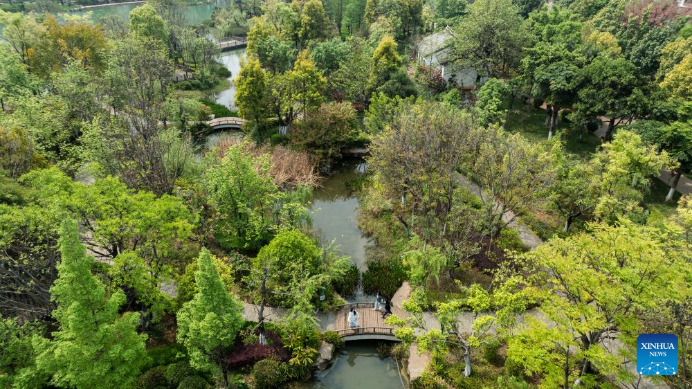 An aerial drone photo taken on April 4, 2025 shows tourists visiting Huquan Ecological Park in Mile City, Honghe Hani and Yi Autonomous Prefecture, southwest China's Yunnan Province. During this year's three-day Qingming Festival holiday, citizens and tourists came to this city's Huquan Ecological Park, Dongfengyun Town, Honghe Nativeland and other places to enjoy the spring scenery. (Xinhua/Hu Chao)