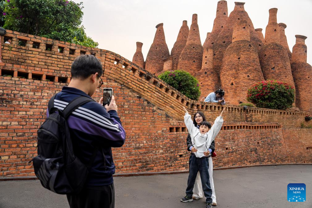 Tourists pose for photos at Dongfengyun Town in Mile City, Honghe Hani and Yi Autonomous Prefecture, southwest China's Yunnan Province, April 5, 2025. During this year's three-day Qingming Festival holiday, citizens and tourists came to this city's Huquan Ecological Park, Dongfengyun Town, Honghe Nativeland and other places to enjoy the spring scenery. (Xinhua/Hu Chao)