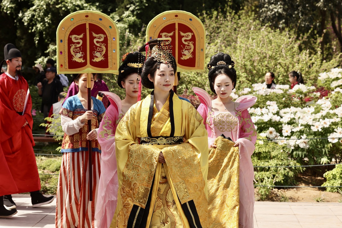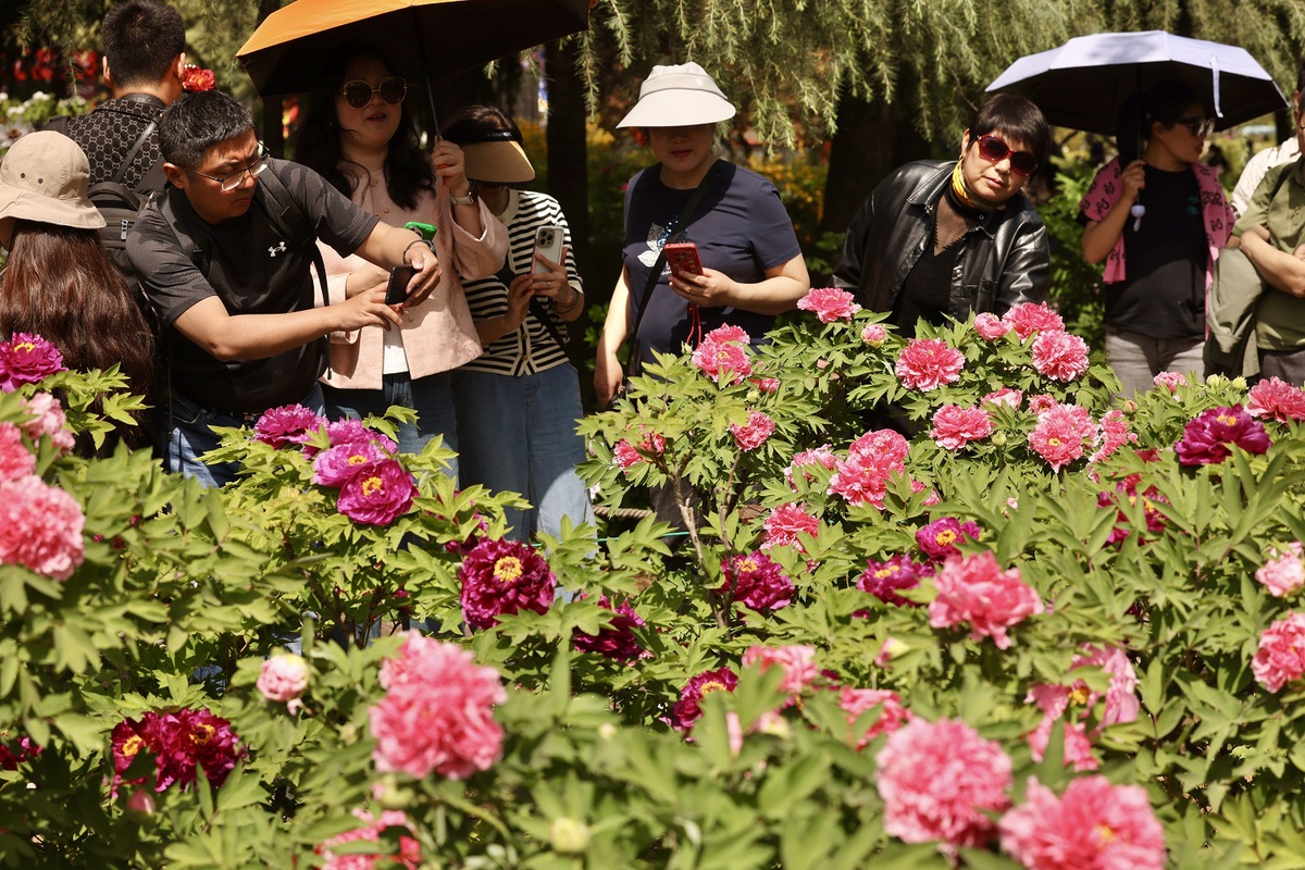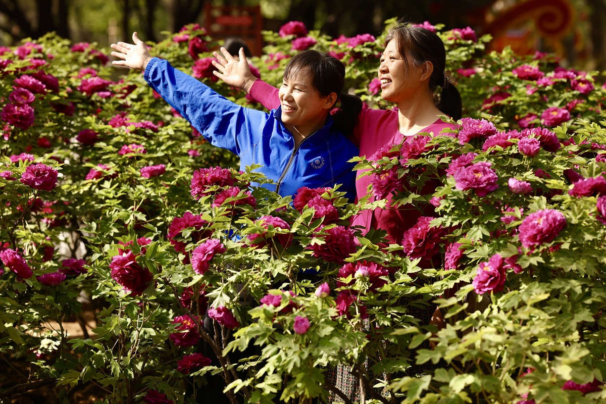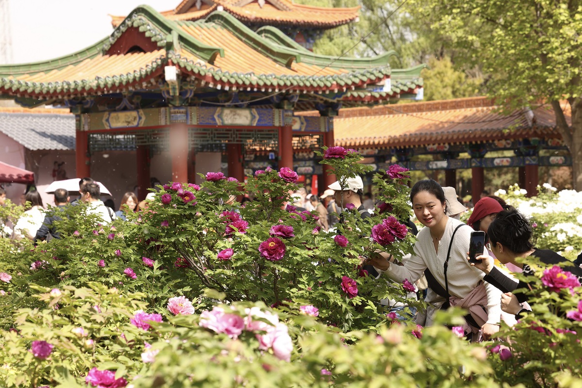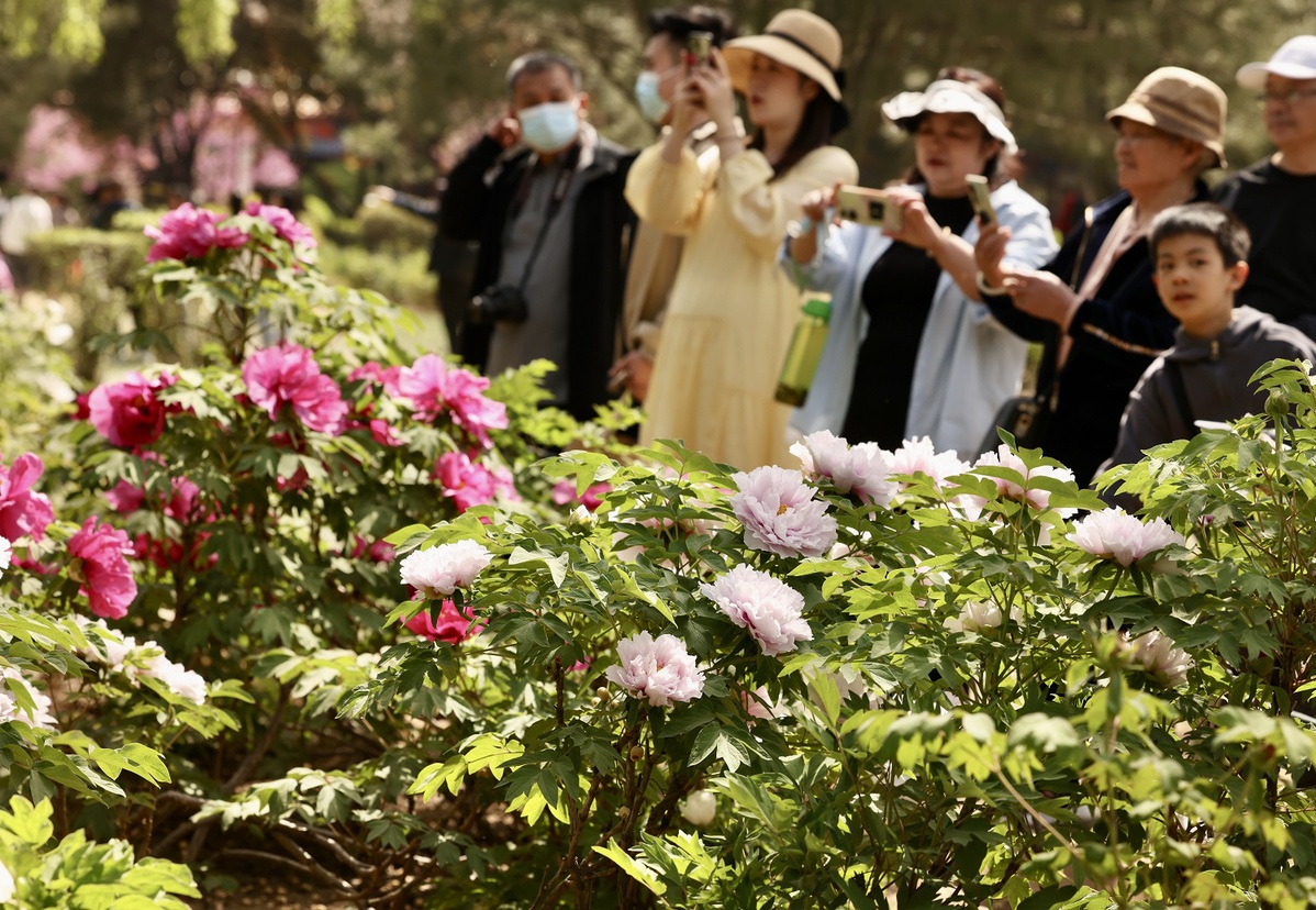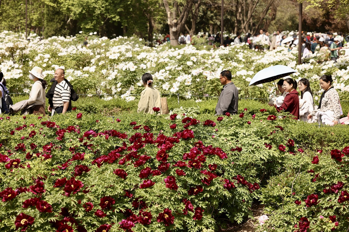 Visitors admire Chinese peonies at a park in Luoyang, Henan province, on April 6, 2025. [Photo by Zhu Xingxin/chinadaily.com.cn]