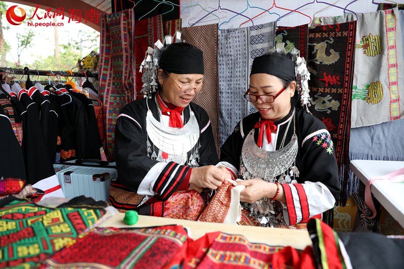 Miao embroiderers in black-and-blue batik clothing demonstrated their skills alongside Li artisans weaving traditional Li brocade, immersing visitors in Hainan's rich ethnic heritage.