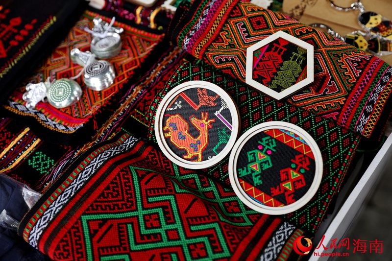 Li brocade refrigerator magnets are showcased during a celebration of the Sanyuesan Festival, which falls on the third day of the third lunar month, in Qiongzhong city, south China's Hainan Province, March 30, 2025. (People's Daily Online/Fu Wuping)